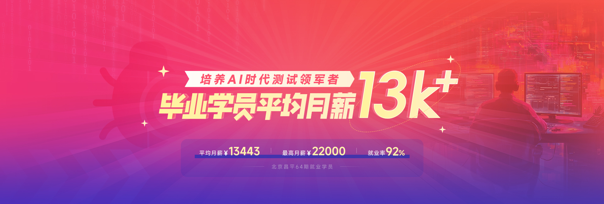 • 昌平校區軟件測試就業64期畢業學員:平均薪資13443元/月,最高薪資22000元/月,就業率92%,月薪過萬27人